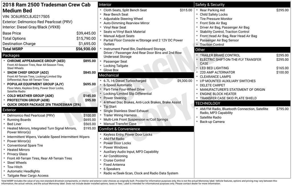 Anti-Spin Differential Rear Axle, Bright Front Bumper, Bright Grille, Bright Rear Bumper, Chrome Appearance Group, Clearance Lamps, I/P Mounted Auxiliary Switches, Protection Group, Quick Order Package 2FA Tradesman, Snow Chief Group, Wheels: 18 x 8.0 Steel Chrome Clad.