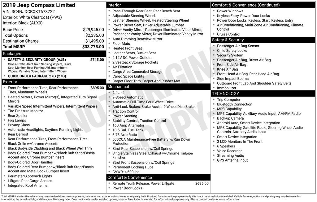 Elevate your driving experience with this exceptional 2019 Jeep Compass Limited. Boasting a sleek White exterior and a meticulously crafted interior, this vehicle seamlessly blends style, comfort, and uncompromising performance. Equipped with a powerful 2.4L I4 engine and a 9-Speed Automatic transmission, the Compass Limited delivers an impressive 22 city/30 highway MPG, making it both efficient and responsive on the road.