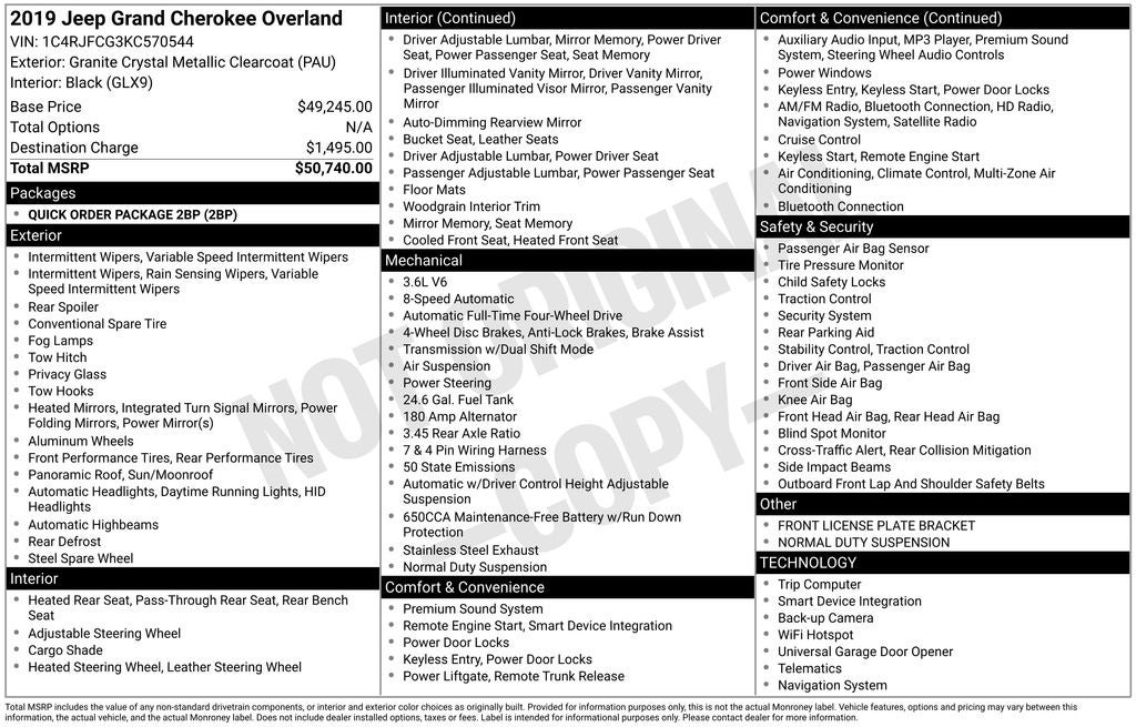 2019 Granite Crystal Metallic Clearcoat Jeep Grand Cherokee Overland 4WD 8-Speed Automatic 3.6L V6 24V VVT