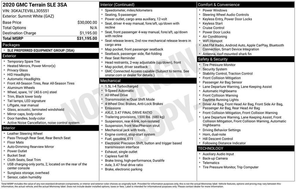 2020 Summit White GMC Terrain SLE AWD 9-Speed Automatic 25/28 City/Highway MPG 1.5L DOHC