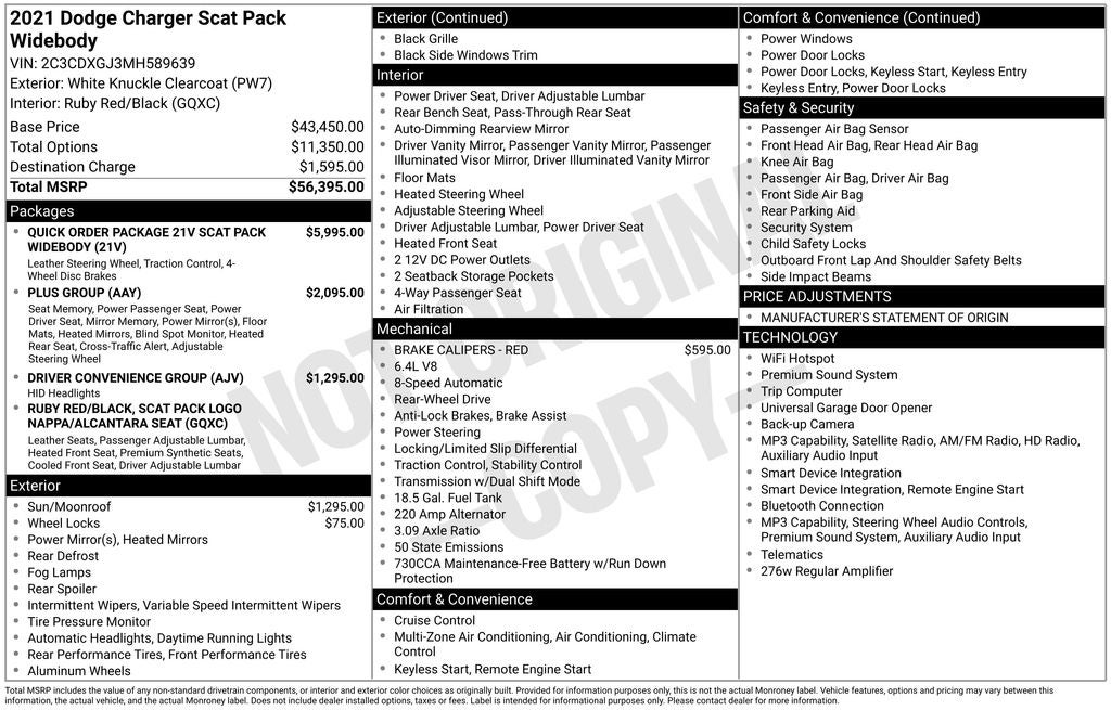 2021 White Knuckle Clearcoat Dodge Charger R/T Scat Pack Widebody RWD 8-Speed Automatic SRT HEMI 6.4L V8 MDS