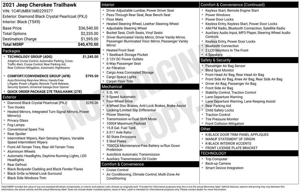2021 Diamond Black Crystal Pearlcoat Jeep Cherokee Trailhawk 4WD 9-Speed Automatic 3.2L V6