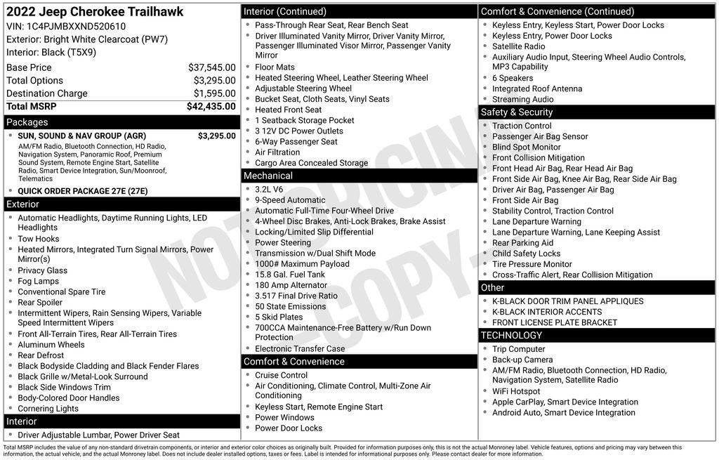 2022 Bright White Clearcoat Jeep Cherokee Trailhawk 4WD 9-Speed 948TE Automatic 3.2L V6