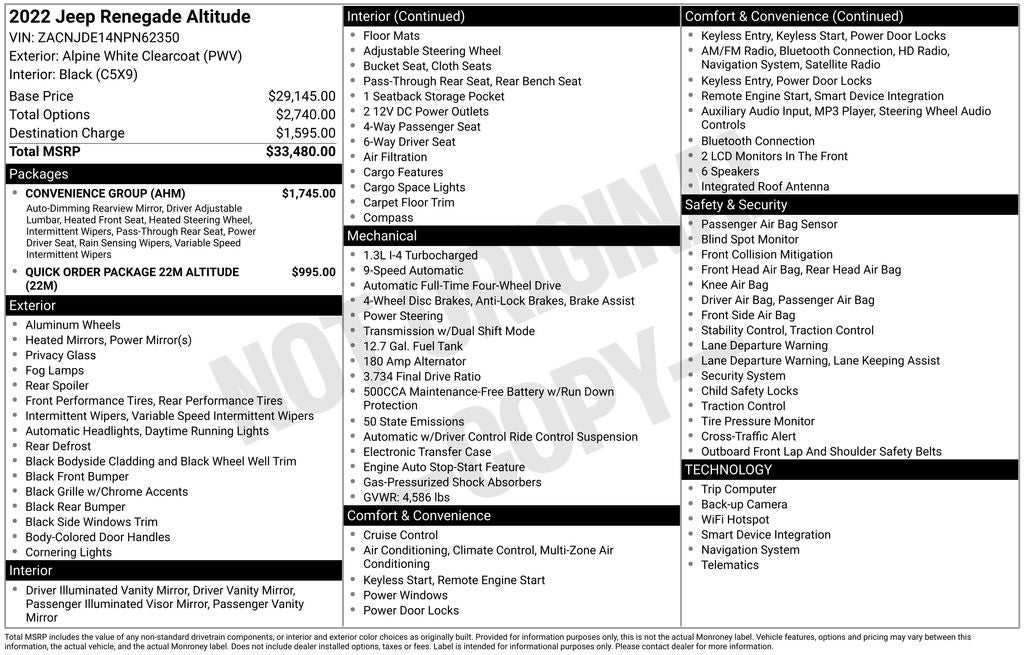 Whether you're embarking on a family road trip, navigating the urban jungle, or exploring the great outdoors, the 2022 Jeep Renegade Altitude is the perfect companion. Experience the perfect blend of style, capability, and technology by visiting our showroom today. We're confident you'll be impressed by this remarkable SUV and the exceptional value it offers.