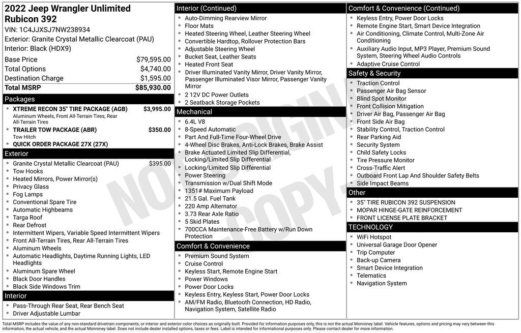 2022 Granite Crystal Metallic Clearcoat Jeep Wrangler Unlimited Rubicon 392 4WD 8-Speed Automatic SRT HEMI 6.4L V8 MDS