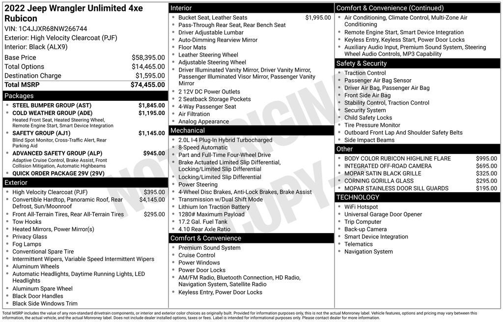 Elevate your driving experience with the advanced technology and premium amenities that make the Wrangler Unlimited Rubicon 4xe a true leader in its class. Enjoy the convenience of Apple CarPlay/Android Auto, the security of Blind Spot & Cross Path Detection, and the comfort of heated front seats and a heated steering wheel.