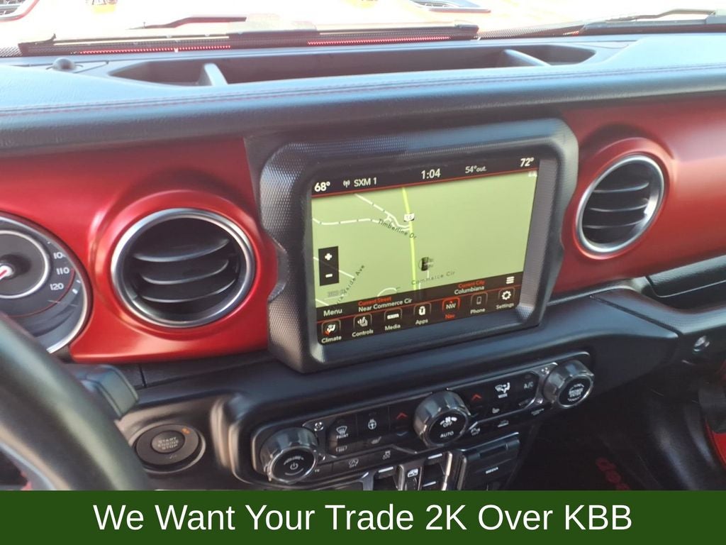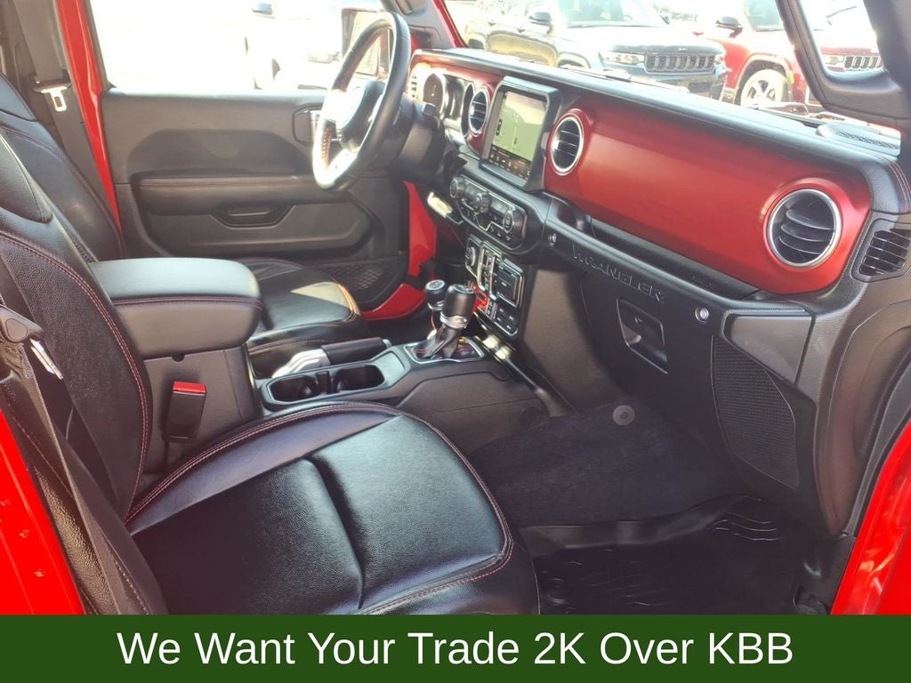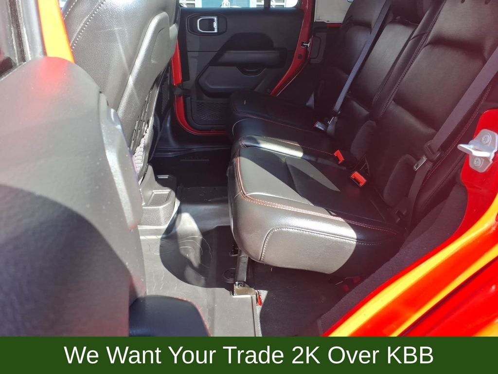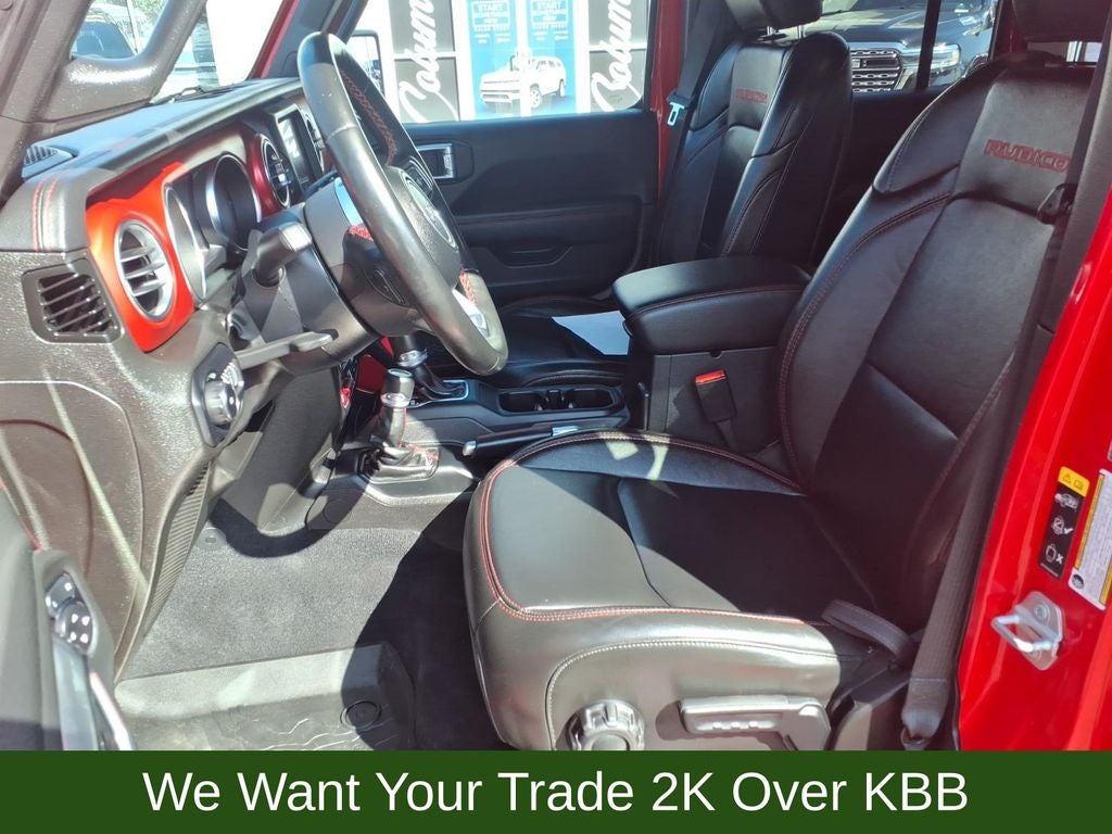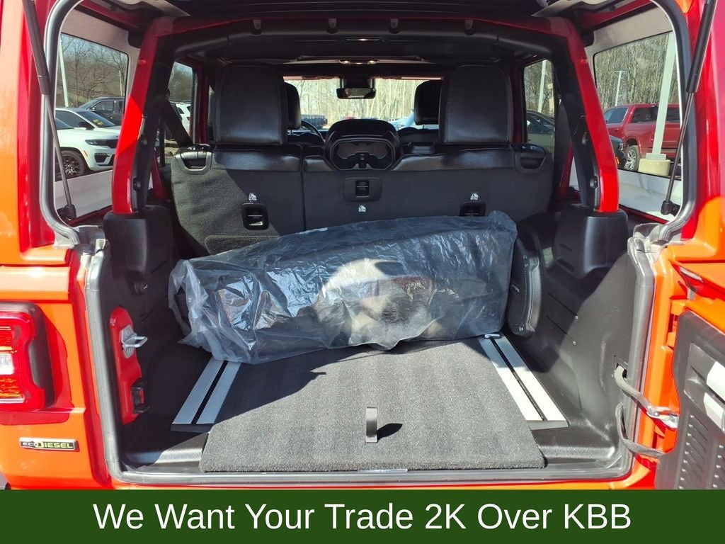 240 Amp Alternator, 4-Wheel Disc Brakes, 7 & 4 Pin Wiring Harness, 700 Amp Maintenance Free Battery, 9 Speakers, ABS brakes, Advanced Brake Assist, Advanced Safety Group, Air Conditioning, Alloy wheels, AM/FM radio: SiriusXM, Apple CarPlay/Android Auto, Auto High Beam Headlamp Control, Auto-dimming Rear-View mirror, Automatic temperature control, Aux Battery, Auxiliary Switches, Blind Spot & Cross Path Detection, Body Color Rubicon Highline Flare, Brake assist, Cargo Compartment Floor Mat, Class II Receiver Hitch, Cold Weather Group, Compass, Corning Gorilla Glass, Daytime Running Lamps LED Accents, Delay-off headlights, Driver door bin, Driver vanity mirror, Dual front impact airbags, Dual front side impact airbags, Electronic Stability Control, Emergency communication system: SiriusXM Guardian, Engine Oil Cooler, Front anti-roll bar, Front Bucket Seats, Front Center Armrest w/Storage, Front dual zone A/C, Front fog lights, Front LED Fog Lamps, Front reading lights, Full Speed Forward Collision Warning Plus, Fully automatic headlights, Garage door transmitter, Heated door mirrors, Heated Front Seats, Heated Steering Wheel, Illuminated entry, Integrated Off-Road Camera, Integrated roll-over protection, Jeep Trail Rated Kit, Leather steering wheel, LED Lighting Group, LED Premium Reflector Headlamps, LED Taillamps, Low tire pressure warning, MOPAR 3.0L Diesel Hood Graphic, MOPAR All-Weather Floor Mats, MOPAR Hinge-Gate Reinforcement, MOPAR Stainless Door Sill Guards, Navigation System, Non-Lock Fuel Cap w/o Discriminator, Occupant sensing airbag, Outside temperature display, Panic alarm, ParkSense Rear Park Assist System, ParkView Rear Back-Up Camera, Passenger door bin, Passenger vanity mirror, Performance Suspension, Power door mirrors, Power steering, Power Top Quarter Window Storage Bag, Power windows, Premium Cloth Low-Back Bucket Seats, Quick Order Package 26R, Radio data system, Radio: Uconnect 4C Nav w/8.4 Display, Rear anti-roll bar, Rear reading lights, Rear Window Defroster, Rear Window Wiper/Washer, Remote keyless entry, Remote Start System, Removable Rear Quarter Windows, Safety Group, Security system, Sky 1-Touch Power Top, Speed control, Split folding rear seat, Steel Bumper Group, Steel Front Bumper, Steel Rear Bumper, Steering wheel mounted audio controls, Stop-Start Dual Battery System, Tachometer, Telescoping steering wheel, Tilt steering wheel, Traction control, Trail Rail Management System, Trailer Tow & HD Electrical Group, Trip computer, Variably intermittent wipers, Voltmeter, Wheels: 17 x 7.5 Machined w/Black Pockets.