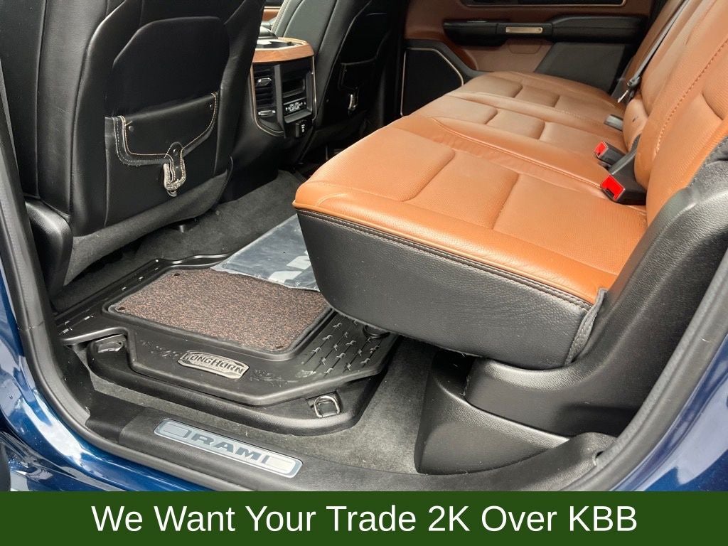 #1 Seat Foam Cushion, 10 Speakers, 12 Touchscreen Display, 3 Rear Seat Head Restraints, 3.21 Rear Axle Ratio, 33 Gallon Fuel Tank, 4 Way Front Headrests, 4-Corner Air Suspension, 4-Wheel Disc Brakes, 48V Belt Starter Generator, 4G LTE Wi-Fi Hot Spot, ABS brakes, Adaptive Cruise Control w/Stop & Go, Adjustable pedals, Air Conditioning, All R1 High Radios, All Radio Equipped Vehicles, Alloy wheels, AM/FM radio: SiriusXM, Apple CarPlay, Apple CarPlay/Android Auto, Audio memory, Auto High-beam Headlights, Auto-dimming door mirrors, Auto-Dimming Exterior Passenger Mirror, Auto-dimming Rear-View mirror, Automatic temperature control, Blind Spot & Cross Path Detection, Brake assist, Bucket Seats, Bumpers: chrome, Chrome Exterior Mirrors, Cold Weather Group, Compass, Connected Travel & Traffic Services, Connectivity - US/Canada, Delay-off headlights, Digital Rearview Mirror, Disassociated Touchscreen Display, Driver door bin, Driver Seat Memory, Driver vanity mirror, Dual front impact airbags, Dual front side impact airbags, Dual Rear Exhaust w/Bright Tips, EcoDiesel Badge, Electronic Stability Control, Engine Block Heater, Exterior Mirrors Courtesy Lamps, Exterior Mirrors w/Heating Element, Exterior Mirrors w/Memory, Exterior Mirrors w/Supplemental Signals, For Details, Visit DriveUconnect.com, For More Info, Call 800-643-2112, Front anti-roll bar, Front Bucket Seats, Front Center Armrest w/Storage, Front dual zone A/C, Front fog lights, Front License Plate Bracket, Front reading lights, Front Seat Back Map Pockets, Front wheel independent suspension, Full Length Premium Floor Console, Fully automatic headlights, Garage door transmitter, Genuine wood console insert, Genuine wood dashboard insert, Genuine wood door panel insert, Global Telematics Box Module (TBM), Google Android Auto, GPS Antenna Input, GPS Navigation, HD Radio, Heads-Up Display, Heated door mirrors, Heated Front Seats, Heated front seats, Heated rear seats, Heated Second Row Seats, Heated Steering Wheel, Heated steering wheel, Heavy-Duty Engine Cooling, Illuminated entry, Integrated Center Stack Radio, Integrated Voice Command w/Bluetooth®, Lane Keep Assist, Leather steering wheel, Leather Trimmed Bucket Seats, LED CHMSL Lamp, Longhorn Level 1 Equipment Group, Low tire pressure warning, Memory seat, MOPAR Winter Front Grille Cover, Navigation System, Occupant sensing airbag, Outside temperature display, Overhead airbag, Overhead console, Panic alarm, Parallel & Perp Park Assist w/Stop, ParkView Rear Back-Up Camera, Passenger door bin, Passenger vanity mirror, Pedal memory, Pedestrian Emergency Braking, Power 4-Way Driver Lumbar Adjust, Power 4-Way Passenger Lumbar Adjust, Power 8-Way Driver & Passenger Seats, Power door mirrors, Power driver seat, Power passenger seat, Power Running Boards, Power steering, Power windows, Power-Folding Mirrors, Quick Order Package 28K Longhorn, Radio data system, Radio: Uconnect 5 Nav w/12.0 Display, Radio: Uconnect 5 Nav w/8.4 Display, Rain sensing wipers, Rear 60/40 Folding Split Recline Seat, Rear anti-roll bar, Rear seat center armrest, Rear step bumper, Rear window defroster, Remote keyless entry, Security system, SiriusXM Radio Service, SiriusXM w/360L, Speed control, Split folding rear seat, Steering wheel mounted audio controls, Tachometer, Tailgate Ajar Warning Lamp, Telescoping steering wheel, Tilt steering wheel, Traction control, Trailer Brake Control, Trailer Light Check, Trailer Reverse Steering Control, Trailer Tire Pressure Monitoring System, Trailer Tow Group, Tri-Fold Tonneau Cover, Trip computer, Turn signal indicator mirrors, USB Host Flip, Variably intermittent wipers, Ventilated Front Seats, Ventilated front seats, Ventilated Rear Seats, Voltmeter, Wheels: 20 x 9 Aluminum Painted/Polished, Wheels: 22 x 9 Polish/Painted w/Inserts, Wireless Charging Pad.