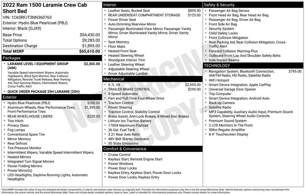 2022 Hydro Blue Pearlcoat Ram 1500 Laramie 4WD 8-Speed Automatic HEMI 5.7L V8 Multi Displacement VVT
