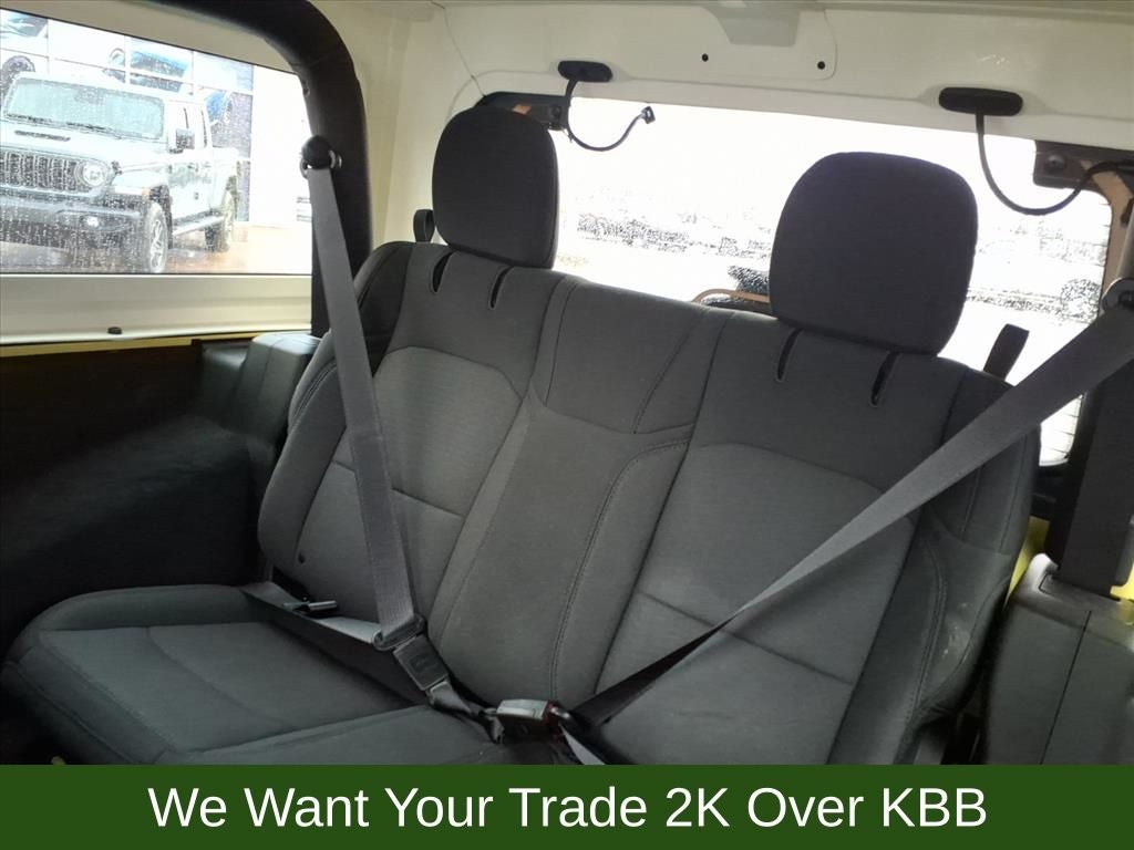 2-Door Passive Entry, Front Door Locks, 3.45 Overall Top Gear Ratio, 4-Wheel Disc Brakes, 8 Speakers, ABS brakes, Air Conditioning w/Auto Temperature Control, Air Filtering, AM/FM radio, Apple CarPlay, Apple CarPlay/Android Auto, Automatic Headlamps, Auxiliary Battery, Black 3-Piece Hard Top, Brake assist, Cloth Low-Back Bucket Seats, Cluster 7.0 TFT Color Display, Cold Weather Group, Compass, Convenience Group, Deep Tint Sunscreen Windows, Delay-off headlights, Driver door bin, Driver vanity mirror, Dual front impact airbags, Dual front side impact airbags, Electronic Stability Control, Emergency communication system: SiriusXM Guardian, Engine Oil Cooler, Freedom Panel Storage Bag, Front 1-Touch Down Power Windows, Front anti-roll bar, Front Bucket Seats, Front Center Armrest w/Storage, Front fog lights, Front reading lights, Google Android Auto, GPS Antenna Input, Heated Front Seats, Heated Steering Wheel, Integrated Center Stack Radio, Integrated roll-over protection, Integrated Voice Command w/Bluetooth®, Low tire pressure warning, MOPAR All-Weather Floor Mats, No Soft Top, Non-Locking Fuel Cap w/o Discriminator, Normal Duty Suspension, Occupant sensing airbag, Outside temperature display, ParkView Rear Back-Up Camera, Passenger door bin, Passenger vanity mirror, Power Heated Mirrors, Power steering, Premium Wrapped Steering Wheel, Quick Order Package 22S Sport S, Radio data system, Radio: Uconnect 4 w/7 Display, Rear anti-roll bar, Rear reading lights, Rear Window Defroster, Rear Window Wiper/Washer, Remote Keyless Entry, Remote Start System, Security Alarm, SiriusXM Satellite Radio, Speed control, Speed Sensitive Power Locks, Sport S, Start-Stop Dual Battery System, Steering wheel mounted audio controls, Sun Visors w/Illuminated Vanity Mirrors, Tachometer, Technology Group, Telescoping steering wheel, Tilt steering wheel, Traction control, Trip computer, Universal Garage Door Opener, USB Host Flip, Variably intermittent wipers, Wheels: 17 x 7.5 Tech Silver Aluminum, Wheels: 17 x 7.5 Black Steel Styled.