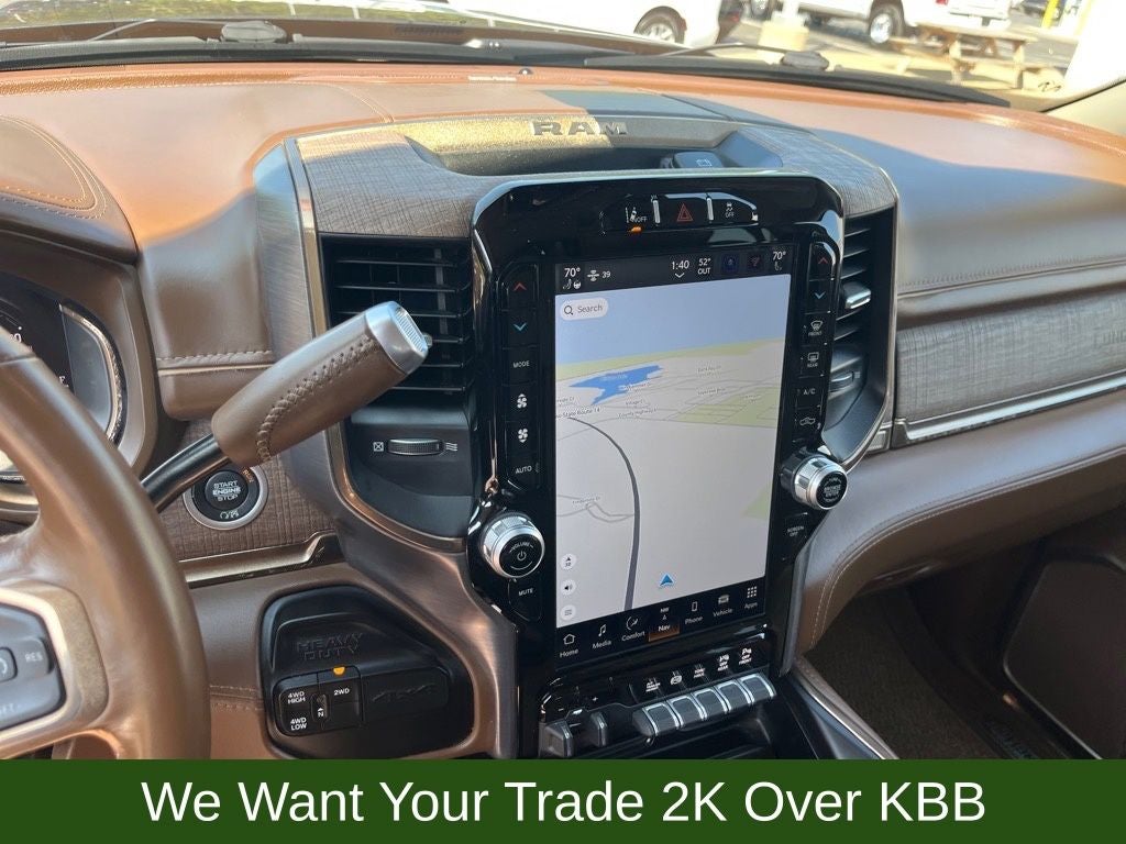 10 Speakers, 115V Auxiliary Rear Power Outlet, 12 Touchscreen Display, 17 Speaker harman kardon Premium Sound, 2 Way Rear Headrest Seat, 220 Amp Alternator, 3.73 Axle Ratio, 4 Way Front Headrests, 4-Wheel Disc Brakes, 4G LTE Wi-Fi Hot Spot, 5th Wheel/Gooseneck Towing Prep Group, ABS brakes, Active Noise Control System, Adaptive Cruise Control w/Stop, Adaptive Steering System, Adjustable pedals, Air Conditioning, Alexa Built-In, Alloy wheels, AM/FM radio: SiriusXM with 360L, Apple CarPlay, Apple CarPlay/Android Auto, Audio memory, Auto High-beam Headlights, Auto Level Rear Air Suspension, Auto-dimming door mirrors, Auto-dimming Rear-View mirror, Automatic temperature control, Blind Spot & Cross Path Detection, Brake assist, Bucket Seats, Bumpers: body-color, Center Hub, Clearance Lamps, Cold Weather Group, Compass, Connected Travel & Traffic Services, Connectivity - US/Canada, CTR Stop Lamp w/Cargo View Camera, Delay-off headlights, Disassociated Touchscreen Display, Driver door bin, Driver vanity mirror, Dual front impact airbags, Dual front side impact airbags, Electronic Stability Control, Electronically Controlled Throttle, Engine Block Heater, Folding Flat Load Floor Storage, For Details Visit DriveUconnect.com, For More Info, Call 800-643-2112, Front anti-roll bar, Front Bucket Seats, Front Center Armrest w/Storage, Front dual zone A/C, Front fog lights, Front License Plate Bracket, Front reading lights, Front Seat Back Map Pockets, Full Length Premium Upgraded Floor Console, Full Speed Forward Collision Warning Plus, Fully automatic headlights, Garage door transmitter, Genuine wood console insert, Genuine wood dashboard insert, Genuine wood door panel insert, Global Telematics Box Module (TBM), Google Android Auto, GPS Antenna Input, GPS Navigation, HD Radio, Heated door mirrors, Heated Front Seats, Heated front seats, Heated rear seats, Heated Second Row Seats, Heated Steering Wheel, Heated steering wheel, High Back Seats, Illuminated entry, Integrated Voice Command w/Bluetooth®, Lane Keep Assist, Leather steering wheel, LED Bed Lighting, Longhorn Level 1 Equipment Group, Low tire pressure warning, Manufacturer's Statement of Origin, Memory seat, MOPAR Spray In Bedliner, MOPAR Winter Front Grille Cover, Navigation System, Occupant sensing airbag, Off-Road Information Pages, Outside temperature display, Overhead airbag, Overhead console, Panic alarm, ParkView Rear Back-Up Camera, Passenger door bin, Passenger vanity mirror, Pedal memory, Power 8-Way Adjustable Passenger Seat, Power Adjust 8-Way Driver Seat, Power Deployable Running Boards, Power door mirrors, Power driver seat, Power passenger seat, Power steering, Power Sunroof, Power windows, Premium Filigree Leather Seats, Quick Order Package 21K Longhorn, Radio data system, Radio: Uconnect 5 Nav w/12.0 Display, Radio: Uconnect 5 Nav w/8.4 Display, Rain sensing wipers, Ramcharger Wireless Charging Pad, Rear 60/40 Folding Seat, Rear reading lights, Rear seat center armrest, Rear step bumper, Rear window defroster, Remote keyless entry, Safety Group, Security system, Selectable Tire Fill Alert, SiriusXM Radio Service, SiriusXM w/360L, Speed control, Split folding rear seat, Steering wheel mounted audio controls, Tachometer, Tilt steering wheel, Tip Start, Traction control, Trailer Tire Pressure Monitoring System, Trailer Tow Pages, Trip computer, Turn signal indicator mirrors, Variably intermittent wipers, Vendor Painted Cargo Box, Vendor Painted Cargo Box Tracking, Ventilated Front Seats, Ventilated front seats, Voltmeter, Wheels: 18 x 8.0 Diamond Cut Face Aluminum, Wheels: 20 x 8.0 Diamond Cut Face Aluminum.