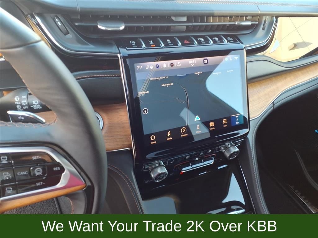 10 Speakers, 19 Speakers High Performance Audio, 3.45 Rear Axle Ratio, 4-Wheel Disc Brakes, 950 Watt Amplifier, ABS brakes, Active Noise Control System, Adaptive suspension, Air Conditioning, Alloy wheels, AM/FM radio: SiriusXM with 360L, Anti-whiplash front head restraints, Audio memory, Auto High-beam Headlights, Auto-dimming door mirrors, Auto-dimming Rear-View mirror, Auto-leveling suspension, Automatic temperature control, Auxiliary Battery, Brake assist, Bumpers: body-color, Compass, Delay-off headlights, Deluxe Headliner, Driver door bin, Driver vanity mirror, Dual front impact airbags, Dual front side impact airbags, Electronic Stability Control, Emergency communication system, Four wheel independent suspension, Front anti-roll bar, Front Bucket Seats, Front Center Armrest w/Storage, Front dual zone A/C, Front fog lights, Front Passenger Interactive Display, Front reading lights, Fully automatic headlights, Garage door transmitter, Genuine wood dashboard insert, Genuine wood door panel insert, Gloss Black Exterior Accents, Heated door mirrors, Heated front seats, Heated rear seats, Heated steering wheel, High Altitude Package, Illuminated entry, Knee airbag, Leather steering wheel, Low tire pressure warning, Memory seat, MOPAR Black Side Steps, Nappa Leather Seats, Navigation System, Neutral Gray Exterior Accents, Normal Duty Suspension, Occupant sensing airbag, Outside temperature display, Overhead airbag, Overhead console, Painted Door Cladding, Palermo Leather Door Trim, Palermo Leather Seats, Panic alarm, Passenger door bin, Passenger vanity mirror, Power door mirrors, Power driver seat, Power Liftgate, Power moonroof, Power passenger seat, Power steering, Power windows, Quick Order Package 23U Summit Reserve, Radio data system, Radio: Uconnect 5 Nav w/10.1 Display, Rain sensing wipers, Rear air conditioning, Rear anti-roll bar, Rear dual zone A/C, Rear reading lights, Rear seat center armrest, Rear window defroster, Rear window wiper, Remote keyless entry, Security system, Speed control, Speed-Sensitive Wipers, Split folding rear seat, Spoiler, Steering wheel memory, Steering wheel mounted audio controls, Summit Reserve, Summit Reserve Badge, Tachometer, Telescoping steering wheel, Tilt steering wheel, Traction control, Trip computer, Turn signal indicator mirrors, Variably intermittent wipers, Ventilated front seats, Ventilated Rear Seats, Voltmeter, Wheels: 20 x 8.5 Fully Painted Aluminum Silver, Wheels: 21 x 9 Black Painted Aluminum, Wheels: 21 x 9 Machined Face/Painted Aluminum.