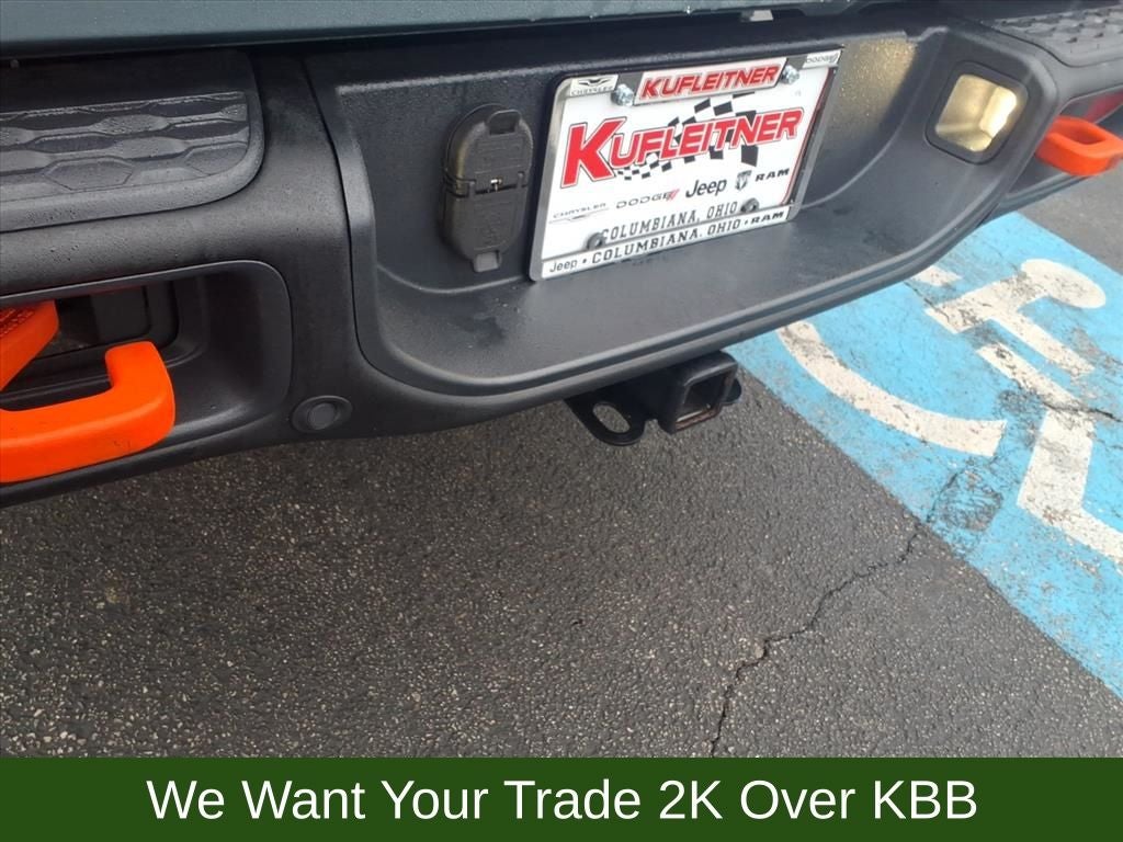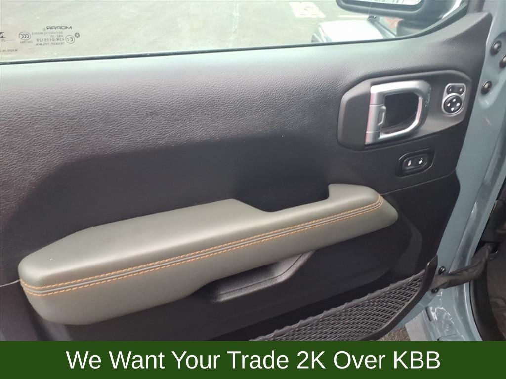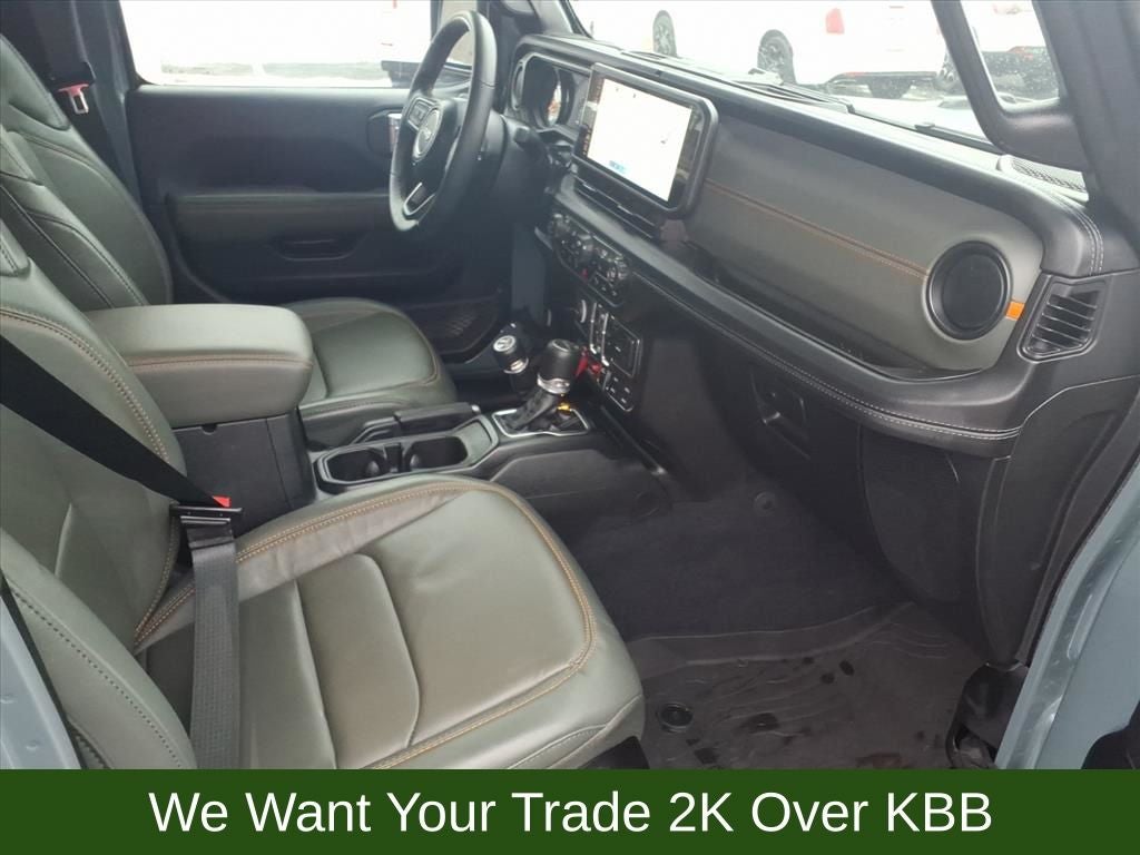 12.3 Touchscreen Display, 4-Wheel Disc Brakes, 4.10 Rear Axle Ratio, 4G LTE Wi-Fi Hot Spot, 8 Speakers, 97 MPH Vehicle Max Speed Calibration, ABS brakes, Air Conditioning, Alexa Built-In, Alloy wheels, Alpine Premium Audio System, AM/FM radio: SiriusXM, Apple CarPlay, Apple CarPlay/Android Auto, Auto High Beam Headlamp Control, Auto-Dimming Rear-View Mirror, Automatic temperature control, Blind Spot & Cross Path Detection, Bluetooth® Wireless Speaker, Body Color 3-Piece Hard Top, Body Color Rubicon Highline Flare, Brake assist, Compass, Connected Travel & Traffic Services, Connectivity - US/Canada, Delay-off headlights, Driver door bin, Driver vanity mirror, Dual front impact airbags, Dual front side impact airbags, Electronic Stability Control, Emergency communication system: Jeep Connect, Freedom Panel Storage Bag, Front anti-roll bar, Front Bucket Seats, Front Center Armrest w/Storage, Front dual zone A/C, Front fog lights, Front reading lights, Full Length Floor Console Premium Armrest, Fully automatic headlights, Google Android Auto, GPS Navigation, Heated door mirrors, Heated Front Seats, Heated Steering Wheel, Heavy Duty Suspension w/Gas Shocks, Illuminated entry, Integrated Off-Road Camera, Integrated roll-over protection, Integrated Voice Command w/Bluetooth®, Leather Trimmed Bucket Seats, Leather Wrapped Park Brake Handle, Leather Wrapped Shift Knob, Low tire pressure warning, MOPAR All-Weather Slush Mats, MOPAR Hardtop Headliner, MOPAR Spray In Bedliner, No Soft Top, Occupant sensing airbag, Outside temperature display, Overhead airbag, Panic alarm, ParkSense Rear Park Assist System, Passenger door bin, Passenger vanity mirror, Power 4-Way Driver Lumbar Adjust, Power 4-Way Passenger Lumbar Adjust, Power Adjust 8-Way Driver Seat, Power Adjust 8-Way Front Passenger Seat, Power door mirrors, Power steering, Power windows, Premium Cloth Seats w/Sport Bolsters, Premium Door Trim Panel, Quick Order Package 24A Mojave X, Radio data system, Radio: Uconnect 5 Nav w/12.3 Display, Radio: Uconnect 5 w/12.3 Display, Rear anti-roll bar, Rear Armrest w/Cupholder Seat, Rear reading lights, Rear Sliding Window, Rear Window Defroster, Remote keyless entry, Security system, SiriusXM Radio Service, SiriusXM w/360L, Speed control, Split folding rear seat, Steel Front Bumper, Steel Rear Bumper, Steering wheel mounted audio controls, Tachometer, Telescoping steering wheel, Tilt steering wheel, Traction control, Trip computer, Universal Garage Door Opener, USB Host Flip, Variably intermittent wipers, Voltmeter, Wheels: 17 x 7.5 Dark Gray Painted.