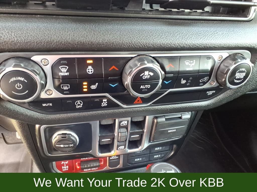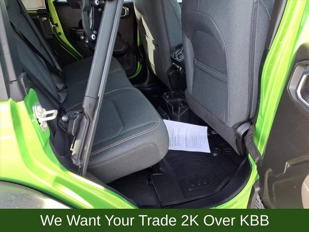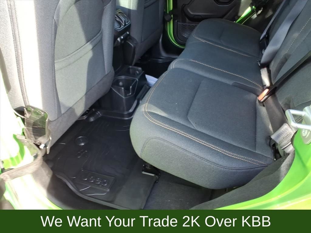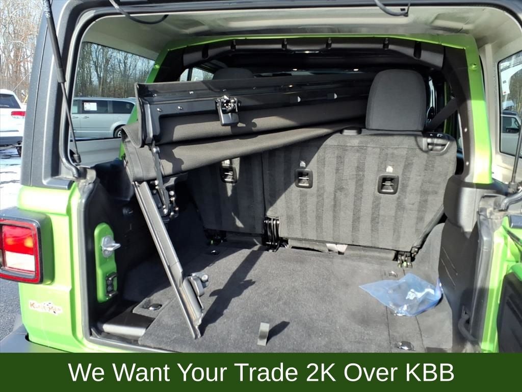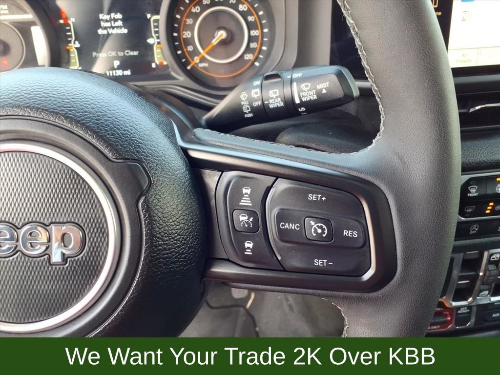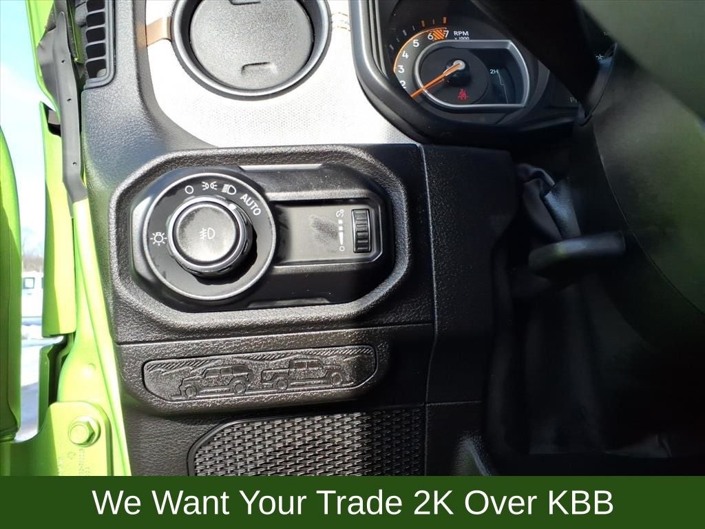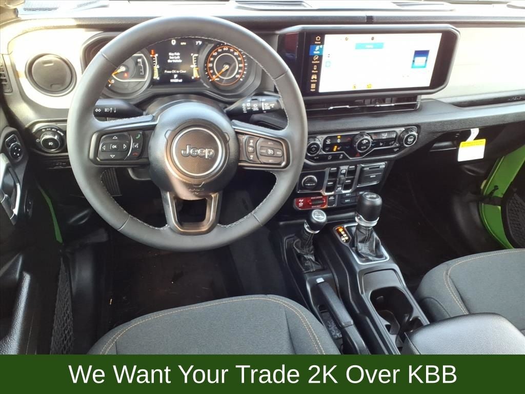 110 MPH Vehicle Max Speed Calibration, 2-Door Passive Entry, Front Door Locks, 4-Wheel Disc Brakes, 4-Wheel Drive Swing Gate Decal, 7 & 4 Pin Wiring Harness, 8 Speakers, 97 MPH Vehicle Max Speed Calibration, ABS brakes, Advanced Brake Assist, Air Conditioning, Air Conditioning w/Auto Temperature Control, Air Filtering, AM/FM radio: SiriusXM, Apple CarPlay/Android Auto, Automatic Headlamps, Aux Battery, Auxiliary Switches, Black 3-Piece Hard Top, Black Grille, Brake assist, Class II Receiver Hitch, Cloth Low-Back Bucket Seats, Cluster 7.0 TFT Color Display, Compass, Convenience Group, Conventional Differential Front Axle, Corning Gorilla Glass, Dana M210 Wide HD Tube Front Axle, Dana M220 Wide Rear Axle, Daytime Running Lamps LED Accents, Deep Tint Sunscreen Windows, Delay-off headlights, Driver door bin, Driver vanity mirror, Dual front impact airbags, Dual front side impact airbags, E-Locker Rear Axle, Electronic Stability Control, Emergency/Assistance Call, Enhanced Adaptive Cruise Control, Freedom Panel Storage Bag, Front anti-roll bar, Front Bucket Seats, Front Center Armrest w/Storage, Front fog lights, Front LED Fog Lamps, Front reading lights, Full Speed Forward Collision Warning Plus, Heated Front Seats, Heated Steering Wheel, Illuminated entry, Injection Molded Black Rear Bumper, Integrated roll-over protection, LED Premium Reflector Headlamps, Low tire pressure warning, Mold In Color Bumper w/Gloss Black, Molded in Color Rubicon Highline Flare, MOPAR All-Weather Floor Mats, MOPAR Sunrider For Hardtop, Non-Lock Fuel Cap w/o Discriminator, Normal Duty Suspension, Occupant sensing airbag, Off-Road Plus Mode, Outside temperature display, Overhead airbag, Panic alarm, ParkView Rear Back-Up Camera, Passenger door bin, Passenger vanity mirror, Power Heated Mirrors, Power steering, Power windows, Premium Wrapped Steering Wheel, Quick Order Package 24W Willys, Radio data system, Radio: Uconnect 5 w/12.3 Display, Rear anti-roll bar, Rear reading lights, Rear Window Defroster, Rear Window Wiper/Washer, Remote keyless entry, Remote Start System, Security Alarm, Speed control, Split folding rear seat, Steering wheel mounted audio controls, Stop-Start Dual Battery System, Sun Visors w/Illuminated Vanity Mirrors, Tachometer, Telescoping steering wheel, Tilt steering wheel, Traction control, Trailer Tow & Aux Switch Group, Trip computer, Universal Garage Door Opener, Variably intermittent wipers, Wheels: 17 x 7.5 Black Steel Styled, Wheels: 17 x 7.5 Painted Black, Willy's Suspension, Willys Hood Decal.